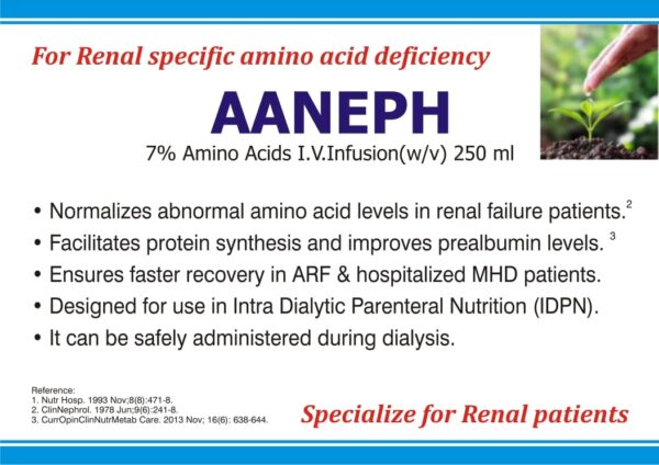 Aaneph IV Infusion is a specialized solution of amino acids designed for direct intravenous administration into the bloodstream. This crucial method bypasses the digestive system, ensuring the immediate delivery of essential nutrients, particularly when oral intake is insufficient, compromised, or contraindicated. Aaneph is indispensable for treating nutritional deficiencies, supporting various vital physiological processes, and is especially beneficial for patients with specific clinical needs, including those with kidney disease.