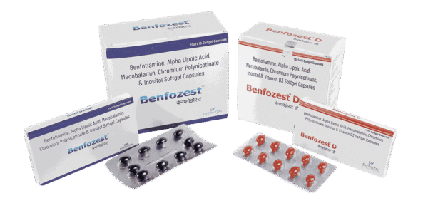 Benfozest Tablet is a potent nutritional supplement meticulously formulated to address various nutritional deficiencies and provide targeted support for neurological health. It combines key ingredients including Benfotiamine, Inositol, Alpha Lipoic Acid, Methylcobalamin, Chromium, and Vitamin D. These components work synergistically to support the proper functioning of the nervous system and help prevent complications arising from nutrient imbalances. Benfozest is particularly beneficial for managing neuropathy, including diabetic nerve damage, and supporting overall body functions that might be compromised by inadequate nutrient absorption.