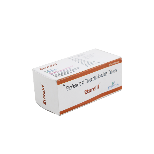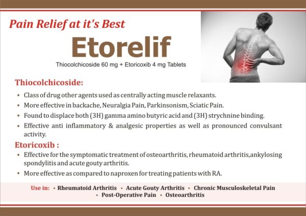 Etorelif Tablet is a highly effective combination medicine featuring Etoricoxib 60mg and Thiocolchicoside 4mg, specifically designed to provide comprehensive relief from pain caused by muscle spasms. This unique formulation acts as both a powerful painkiller and a muscle relaxant, significantly improving muscle movement and alleviating the discomfort, inflammation, and swelling associated with various musculoskeletal conditions.