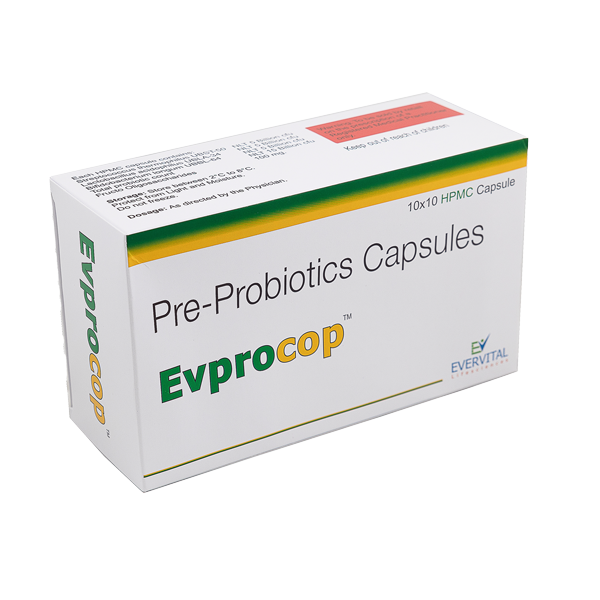 Evprocop Capsule, a specialized Pre-Probiotic HPMC (15 Billion CFU) combination, is innovatively formulated to address the complex challenges of Chronic Kidney Disease (CKD). It works by harnessing the power of beneficial gut flora to help manage the accumulation of uremic toxins, a critical aspect of kidney impairment. Evprocop promotes a healthy gut environment that significantly contributes to reducing the burden on compromised kidneys.