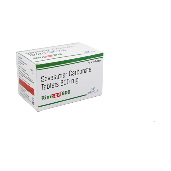 Rimsev 800 Tablet, containing Sevelamer Carbonate 800mg, is a specialized prescription medication engineered to effectively manage elevated phosphate levels in the blood (hyperphosphatemia). It is an essential component of treatment for patients undergoing dialysis due to severe chronic kidney disease (CKD). As a potent phosphate binder, Rimsev 800 acts by preventing the absorption of dietary phosphate from the intestine, thereby lowering blood phosphate levels and helping to prevent complications such as hypocalcemia (low calcium levels) often caused by high phosphorus.
