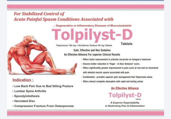 Topilyst D Tablet is a highly effective combination medicine featuring Tolperisone 450 mgSR and Diclofenac 100mg, specifically formulated to provide comprehensive relief from pain and discomfort caused by muscle spasms. This unique blend acts both as a potent painkiller and a muscle relaxant, significantly reducing muscle stiffness, easing pain, and improving overall muscle movement and flexibility.