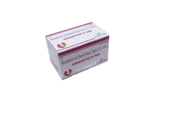 Vidamytil-S 360 MG Tablet from Evervital Lifesciences provides essential and tailored immunosuppressive therapy for pediatric kidney transplant recipients, playing a critical role in preventing organ rejection and ensuring optimal long-term outcomes for these young patients.